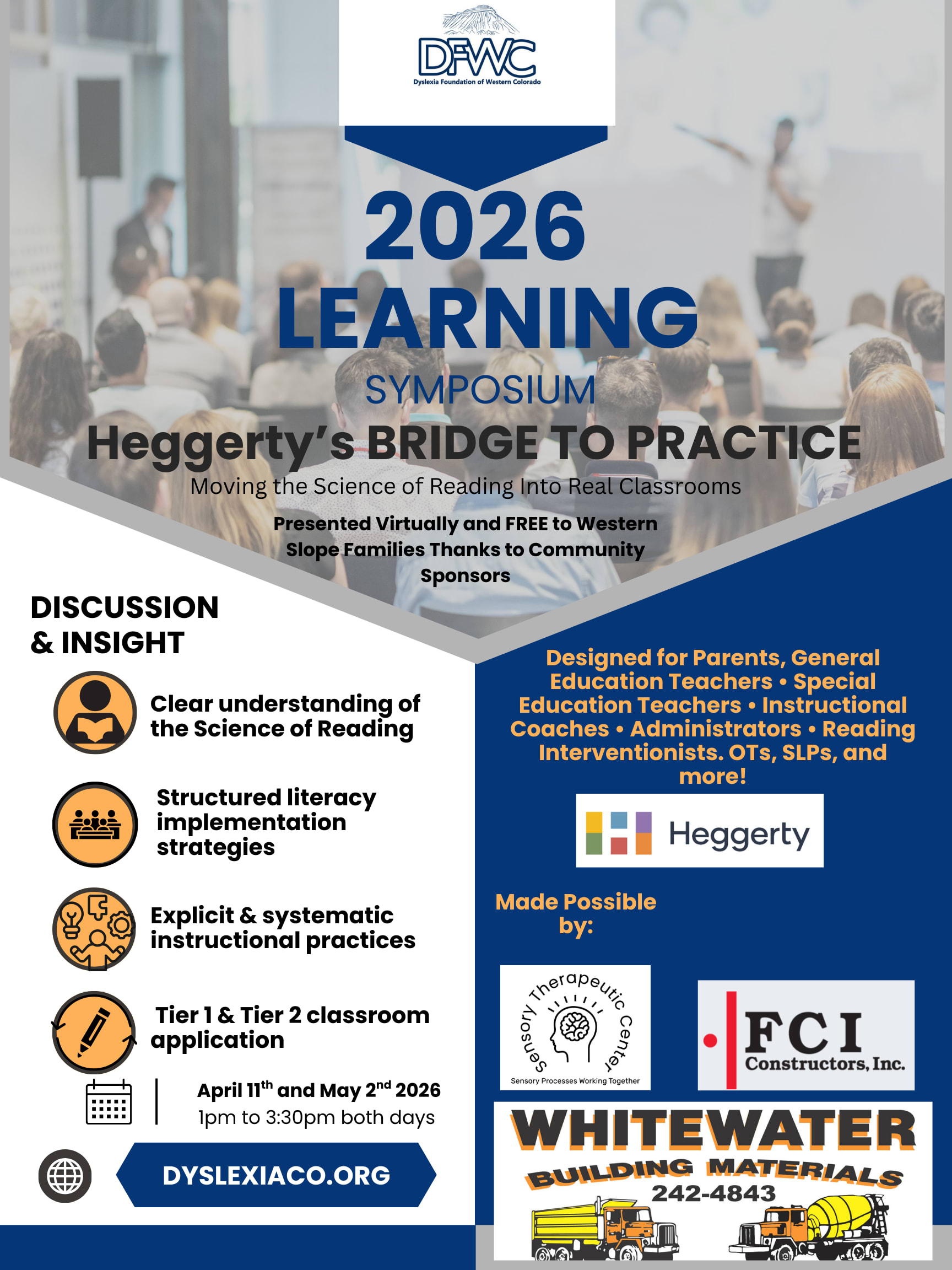 Moving the science of reading into real classrooms. Designed for parents, general education teachers, special education teachers, instructional coaches, administrators, reading interventionists, OTs, SLPs, and more! Discussion and insight re: o Clear understanding of the science of reading. o Structured literacy implementation strategies. o Explicit and systematic instructional practices. o Tier 1 and Tier 2 classroom application. This symposium is presented in two parts - 1:00 p.m. to 3:30 p.m. on APRIL 11 and 1:00 to 3:30 p.m. on MAY 2. Call (970) 208-5432 or email Dyslexia Foundation of Western Colorado with any questions or visit our website at www.dyslexiaco.org.